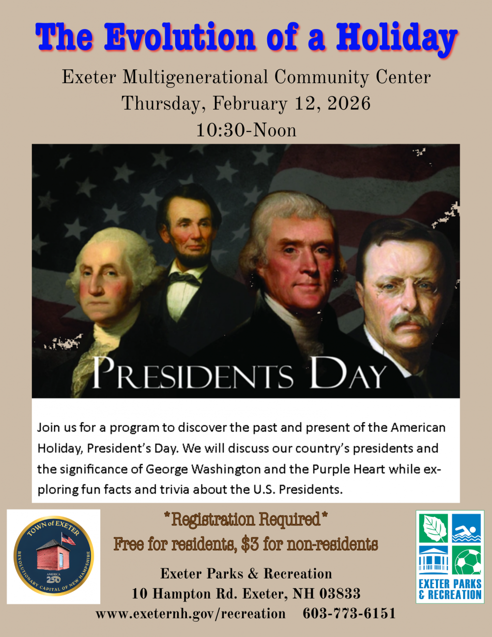 Kick off America’s 250th celebrations with EPRD at our educational presentation, The Evolution of a Holiday! Discover the past and present of the American Holiday, President’s Day, with Robin Shelgren from Learning through the Ages, participants will learn about our country’s presidents and the significance of George Washing and the Purple Heart while exploring fun facts and trivia about the U.S. Presidents.