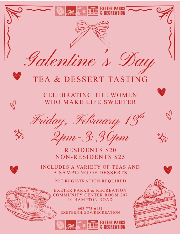 Galentine’s Day Tea & Dessert Tasting Hosted by the Ladies of Exeter Parks & Recreation Program Description: Grab your gal pals and join us for a delightful Galentine’s Day Tea & Dessert Tasting at the Exeter Parks & Recreation Community Center! This special afternoon gathering is the perfect way to celebrate friendship, laughter, and a little indulgence. Enjoy a curated selection of teas and decadent desserts while spending quality time with friends old and new. Whether you come with your besties or plan to make some new ones, this cozy and elegant event is all about connection, conversation, and celebrating the amazing women in our community. Come sip, sample, and celebrate Galentine’s Day with Exeter Parks & Recreation!